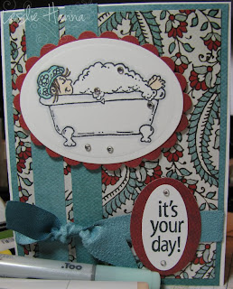 This card uses a lot of the papers. This is a time when a lotta layers is a good thing. Let's see - the blue layer, the pattern layer, the red scallop, the two blue strips, and the red layer under the sentiment. The white card base and the other white pieces are all from The Heap. Woo-hoo! I used a few more inches of that yummy ribbon, and I also colored the image with Copics. I decided to leave the tub and the bubbles white, as they should be, and just added some Cool Grey (C-1) around the edges and for some highlights. I went back when it was all done and added the bling. Not so sure that was a good idea....