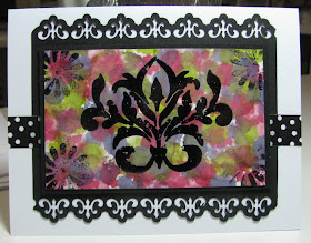 The colored piece was one of the alcohol ink techniques from the class. I stamped over it with two stamps from a Hero Arts set, then layered it onto a piece of black on which I punched two rows using a Fleur de Lis punch (EK Success, I think). As a final touch, I stuck on two pieces of polka-dotted paper tape I picked up on one of our crafty shopping sprees. *ahem*